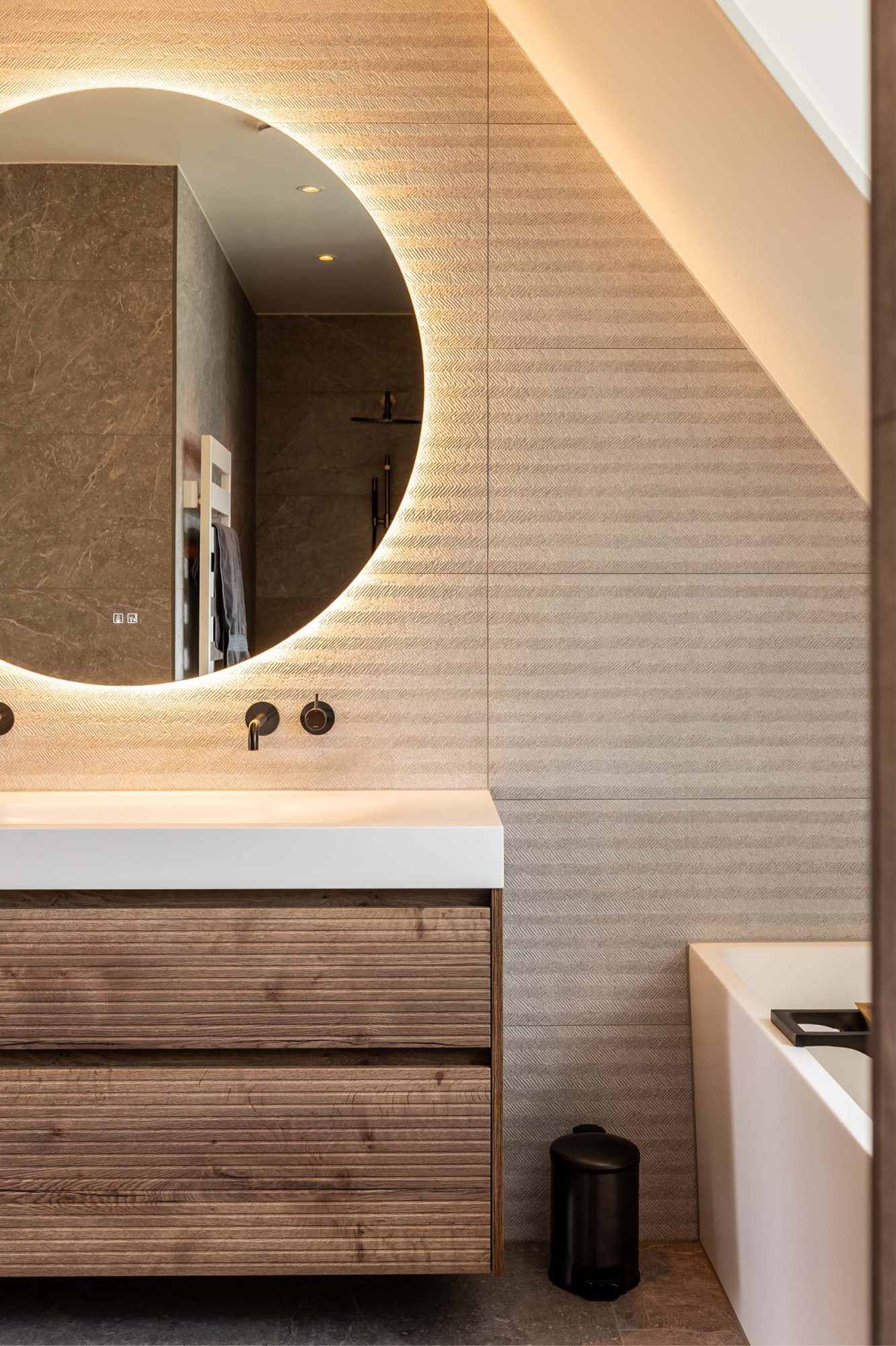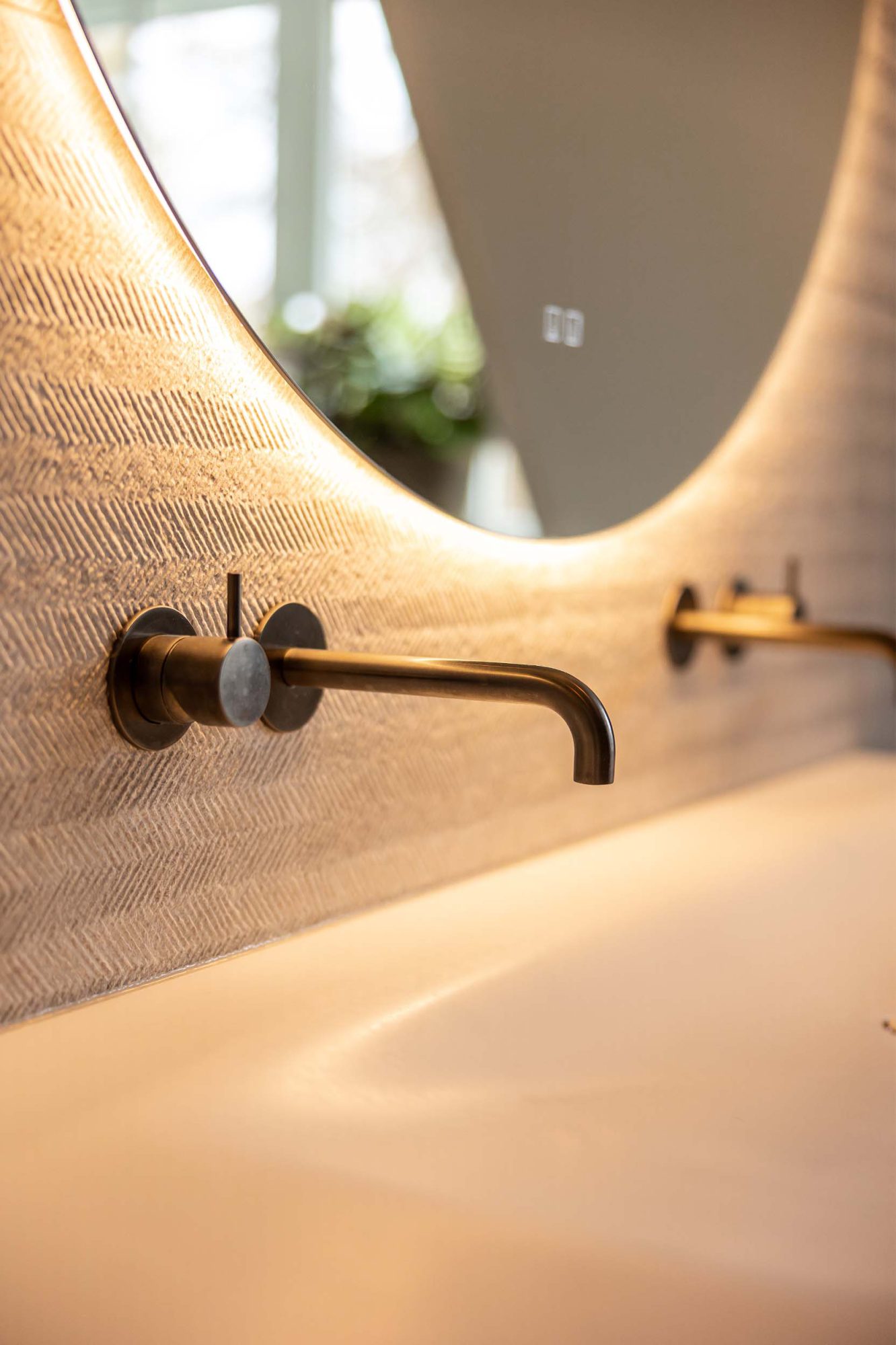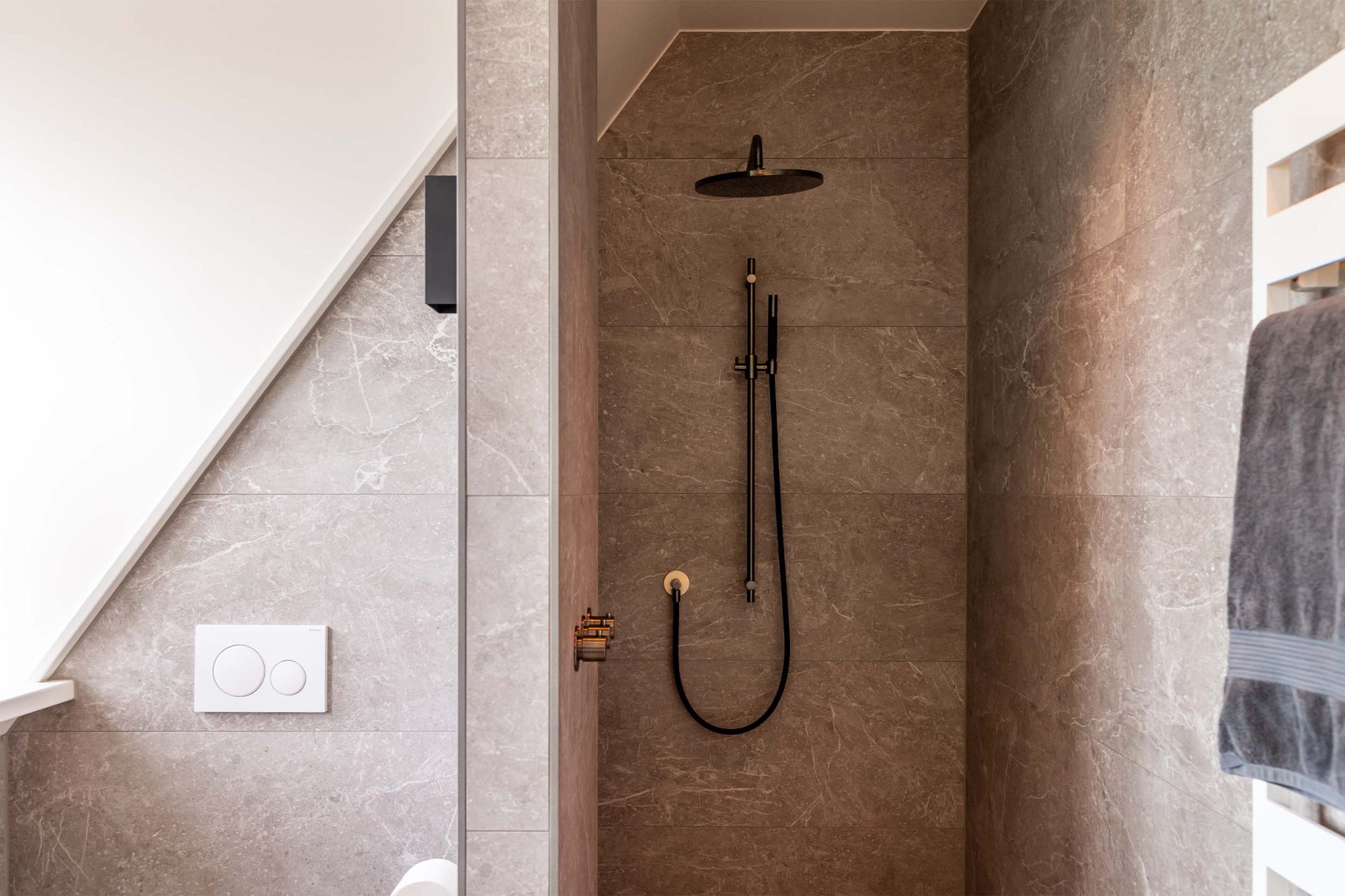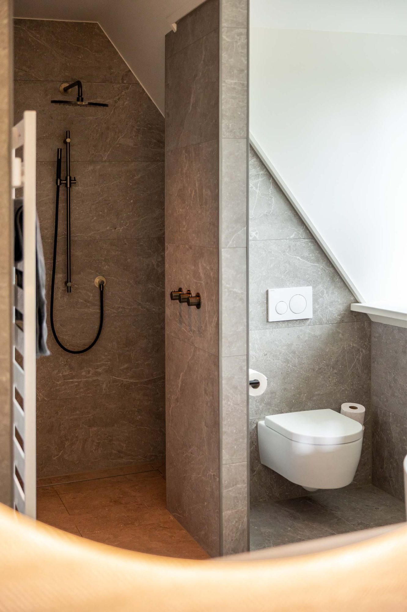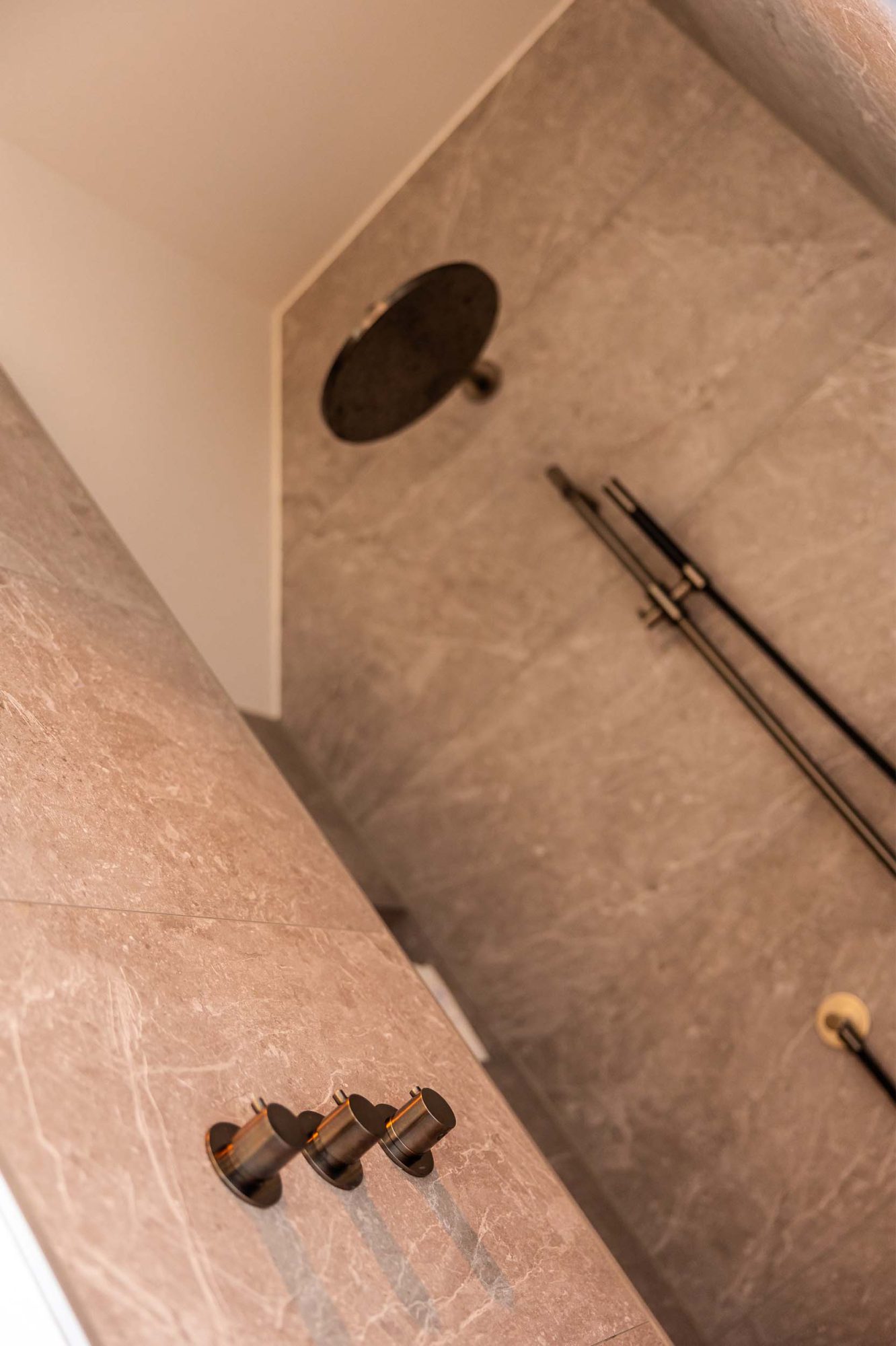Deze robuuste badkamer maakt indruk met grijs marmeren Porcelanosa tegels en een speels V-motief achter de wastafel. De Hotbath kranen in Aged Iron zijn stijlvol weggewerkt in de wand. Het Primabad meubel met ribbelfront in tabak oak versterkt het stoere, luxe karakter.