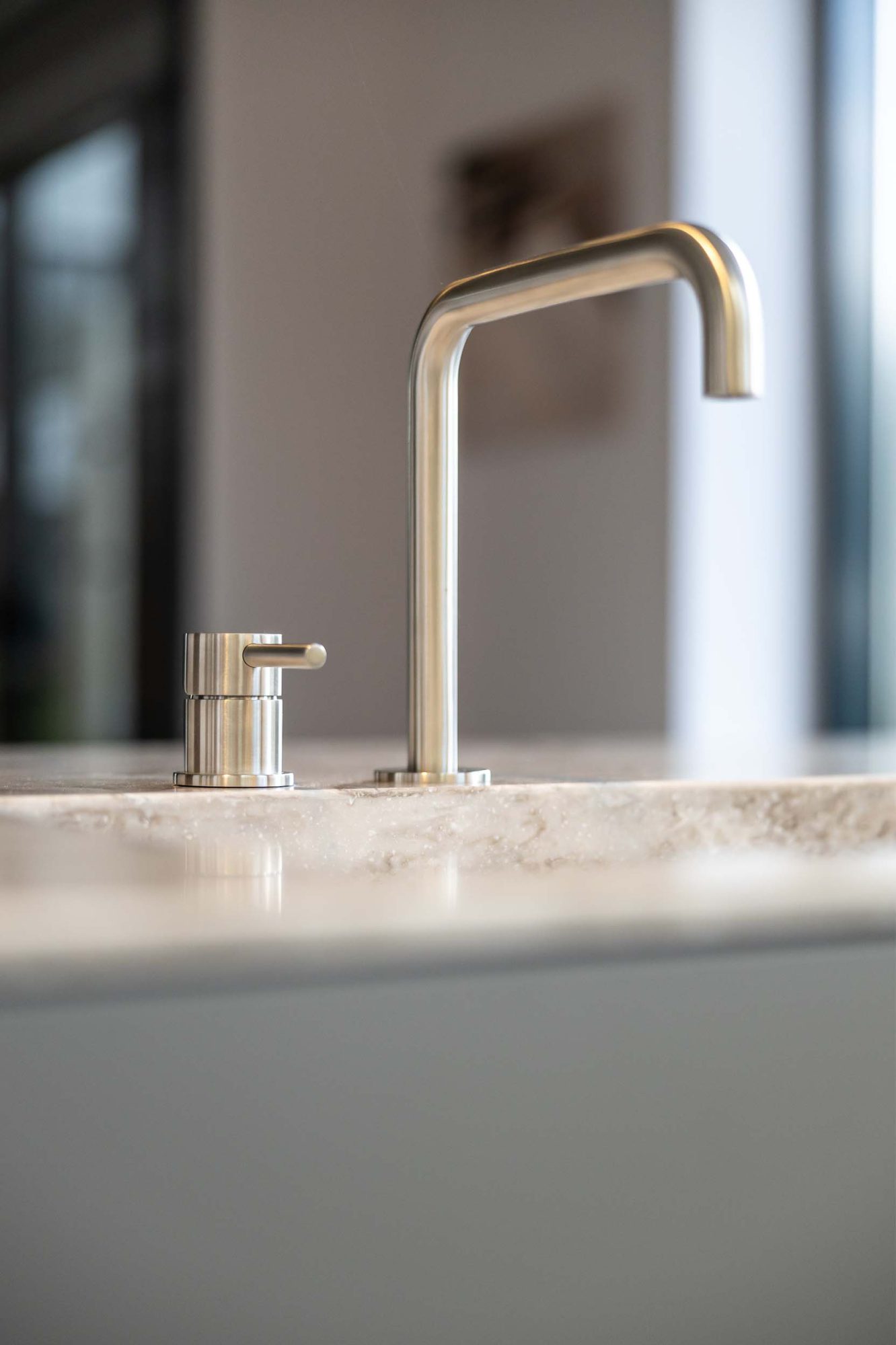 Geen keukeneiland, maar een op maat gemaakt badkamermeubel van ELISE Meubelen. In combinatie met het beige bad van Detremmerie creëert u een luxe badkamer met functionaliteit en perfect afgestemde details voor uw persoonlijke stijl.