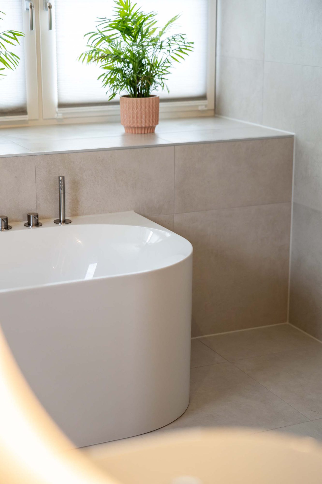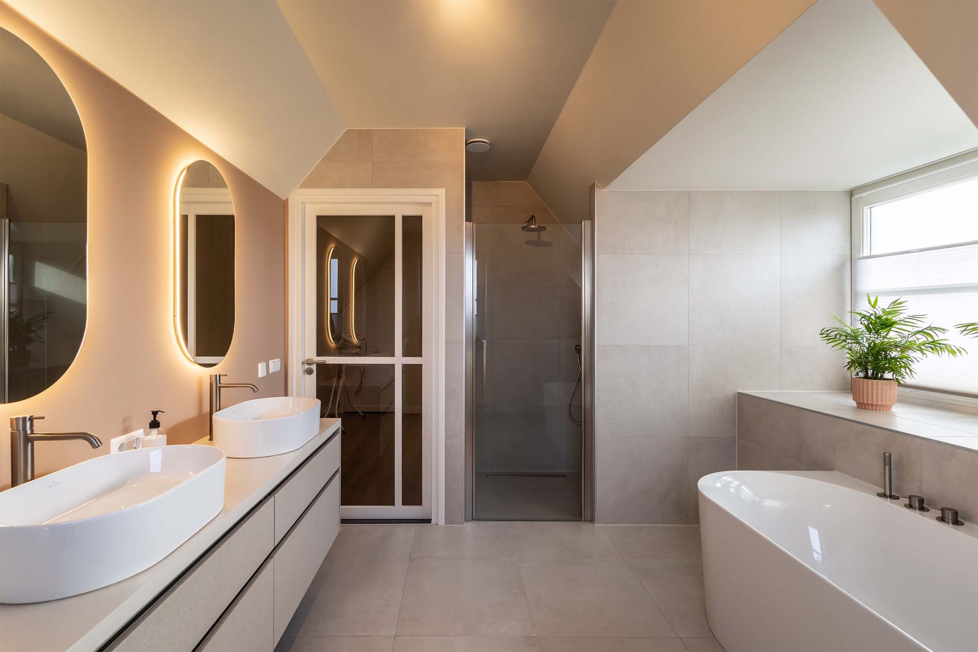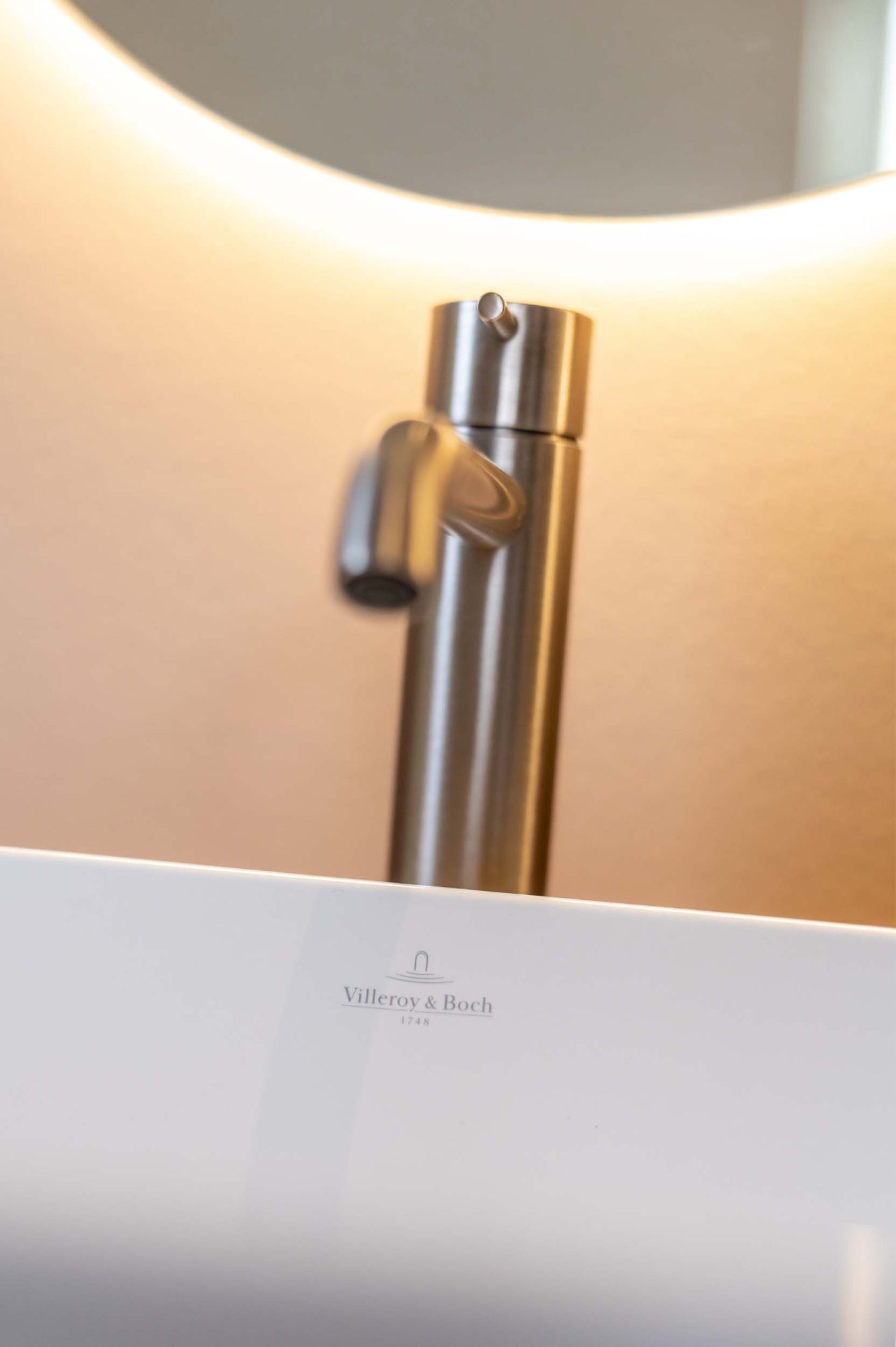 Deze serene badkamer valt op door de terugkerende ronde vormen, prachtig benadrukt door de strakke opzetkommen van Villeroy & Boch. Het meubel in Wool Beige geeft een frisse twist, terwijl de RVS kranen subtiel opgaan in het geheel. Zo ontstaat een rustige en harmonieuze sfeer.