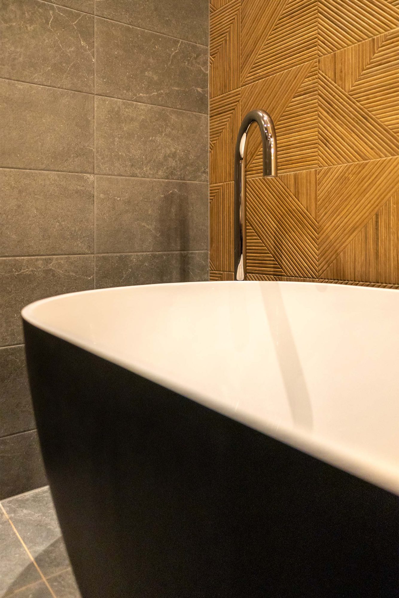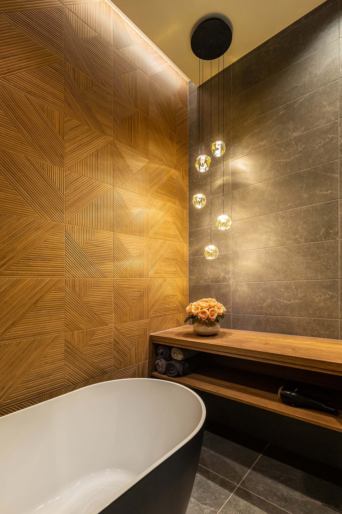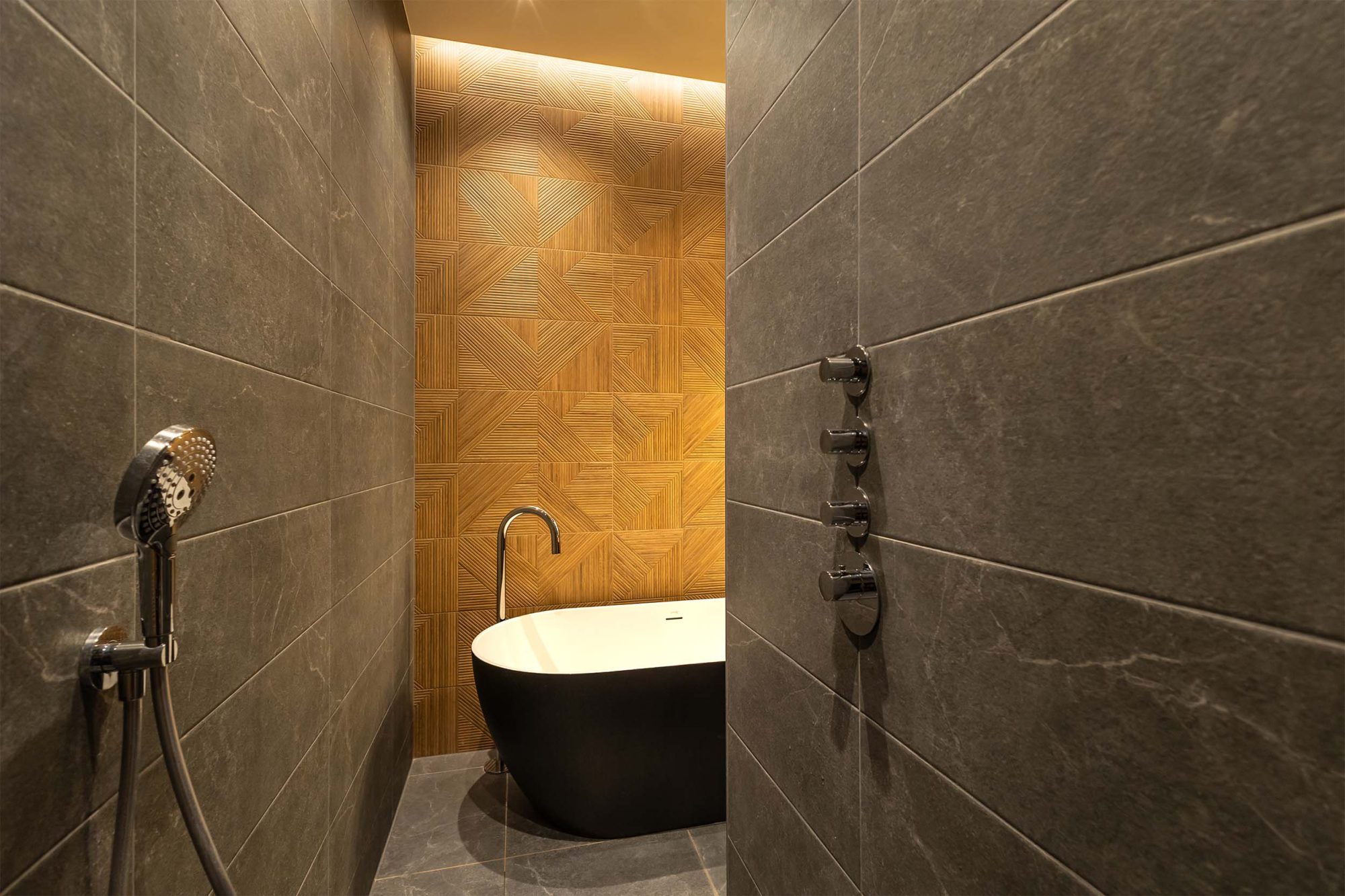 Deze luxe badkamer met een hoog plafond van 3 meter straalt robuuste elegantie uit door warme houtkleuren en donker marmer. Inbouwkranen van Hotbath en een grote hoofddouche zijn slim verborgen achter een speelse scheidingswand met veel decoratieve opbergruimte.