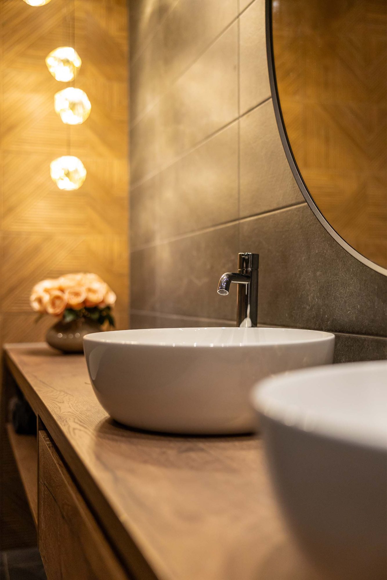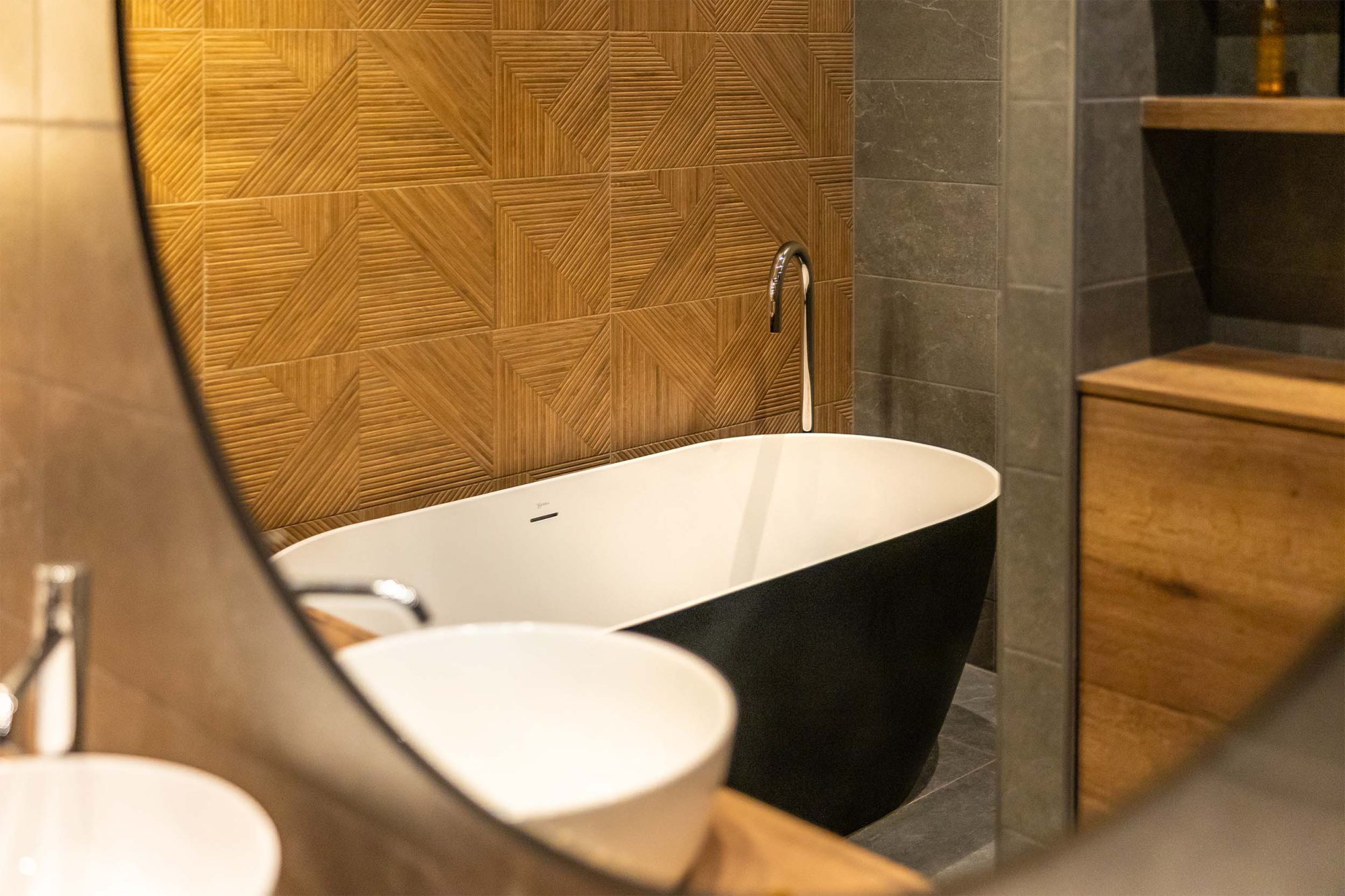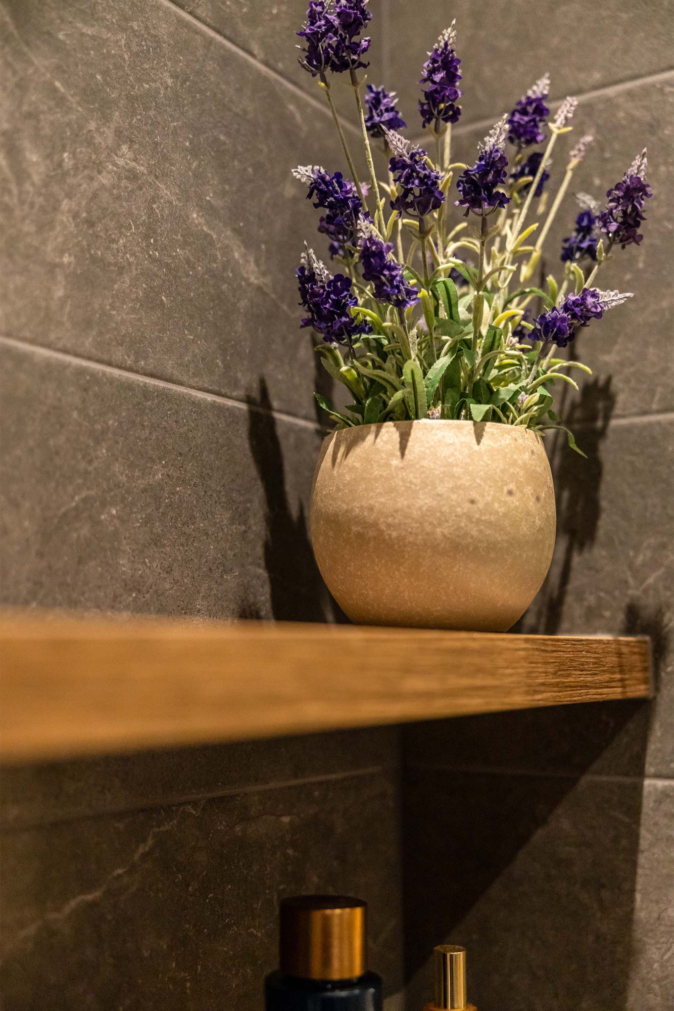 Deze luxe badkamer met een hoog plafond van 3 meter straalt robuuste elegantie uit door warme houtkleuren en donker marmer. Inbouwkranen van Hotbath en een grote hoofddouche zijn slim verborgen achter een speelse scheidingswand met veel decoratieve opbergruimte.