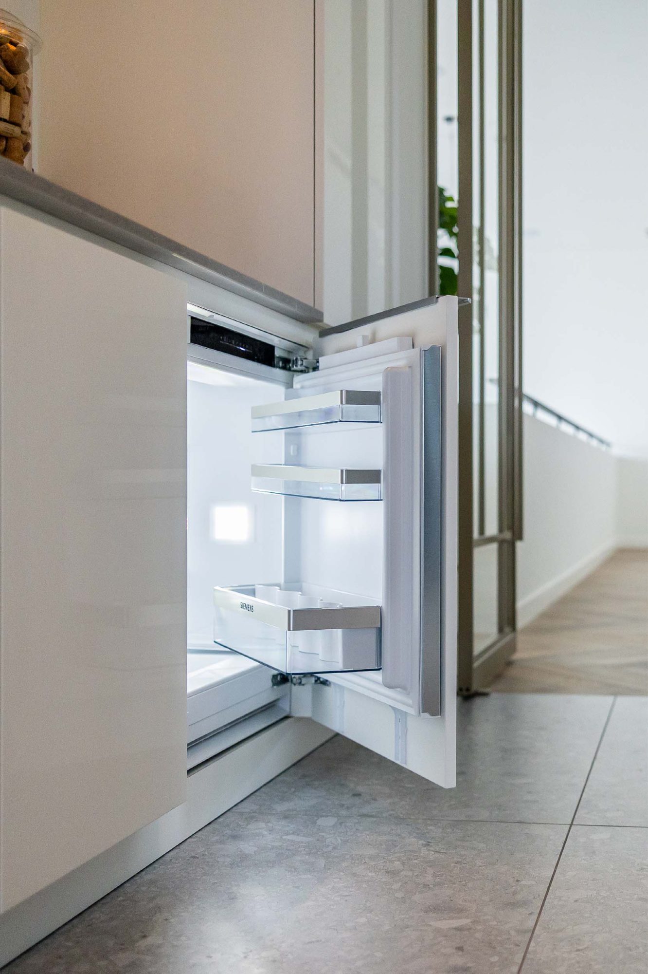 In deze luxe bijkeuken valt het prachtige hoogglans witte front meteen op. Het werkblad van Kemie voegt een stijlvolle touch toe, terwijl de Siemens vaatwasser en koelkast zorgen voor optimaal gebruiksgemak. Een ruimte waar functionaliteit en elegantie perfect samenkomen.