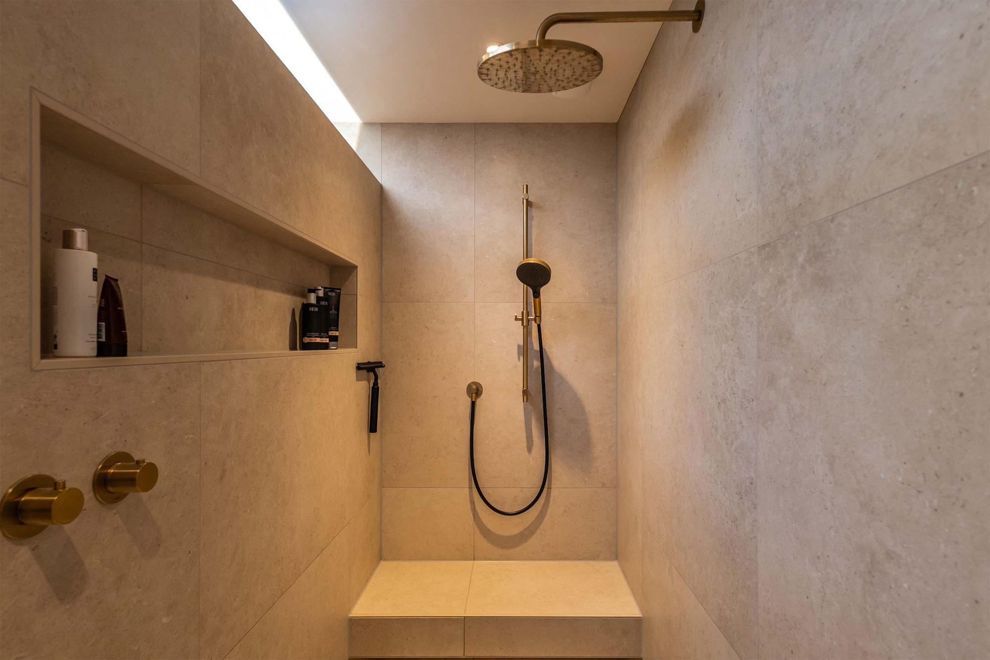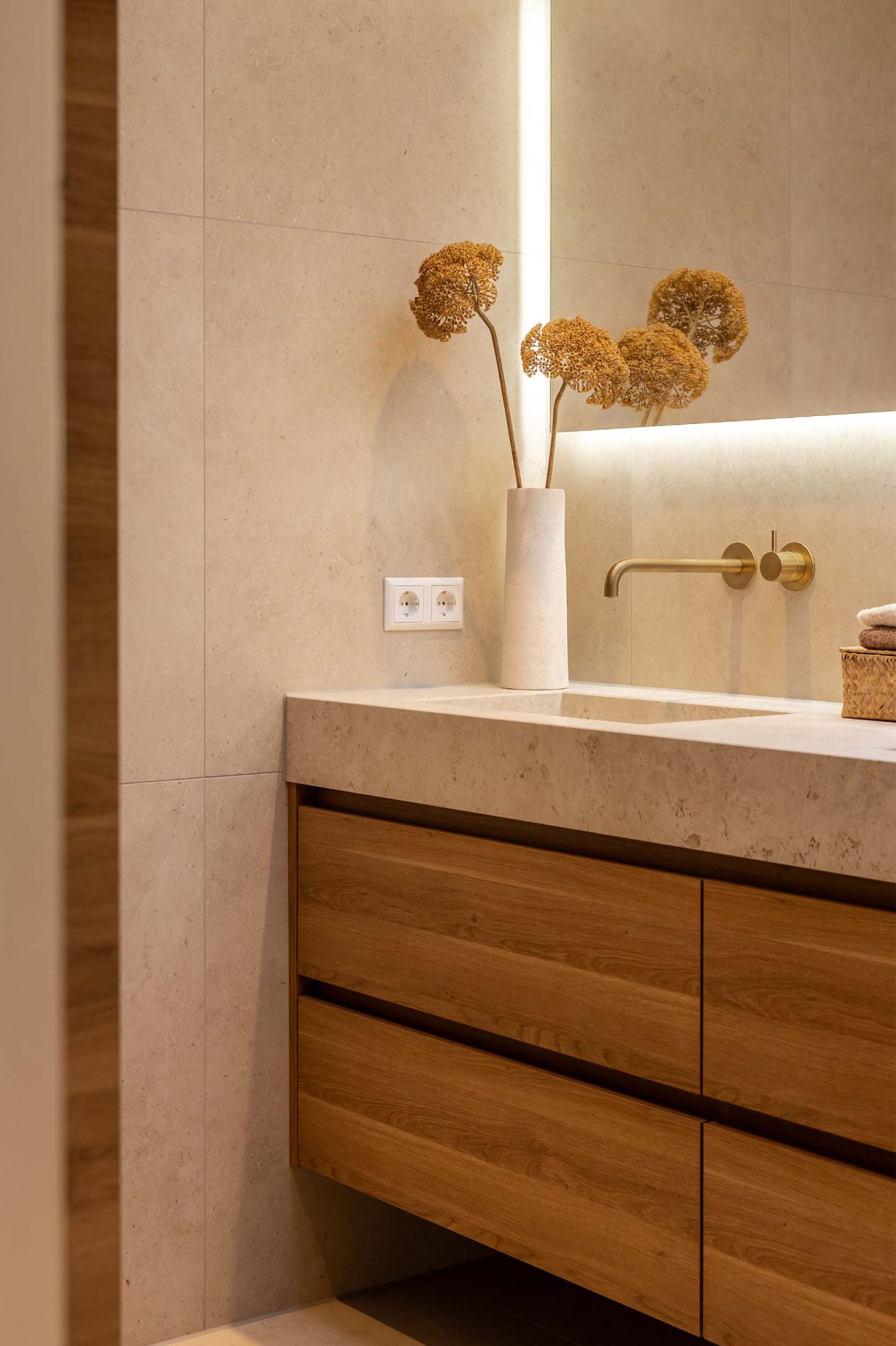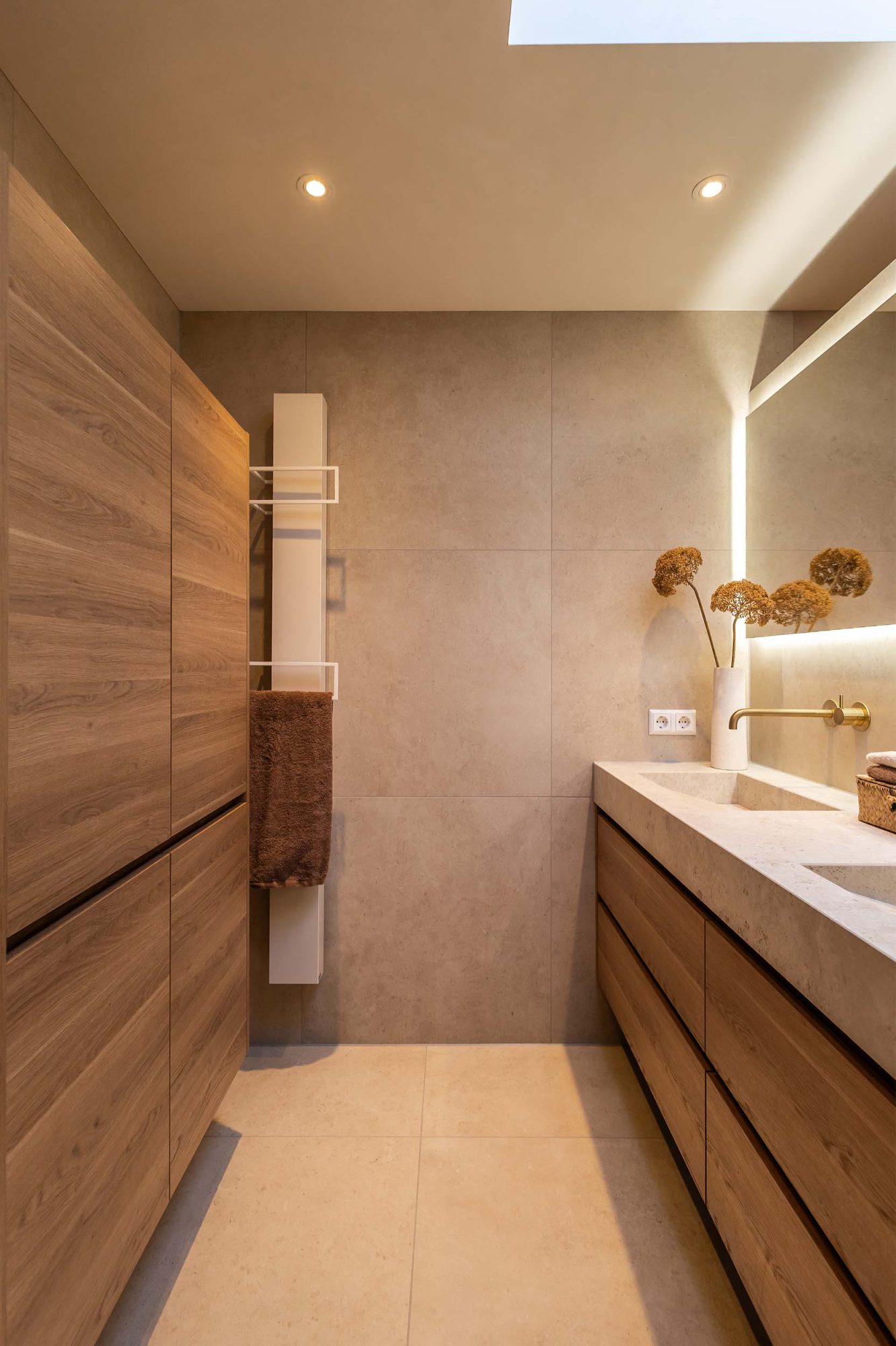 Kijk mee in deze luxe badkamer waar een op maat gemaakte wastafel van Cosentino centraal staat. De messing kranen van Hotbath geven een hotelchique uitstraling, terwijl de tegels op wand en vloer in dezelfde kleur zorgen voor een rustige en harmonieuze sfeer.