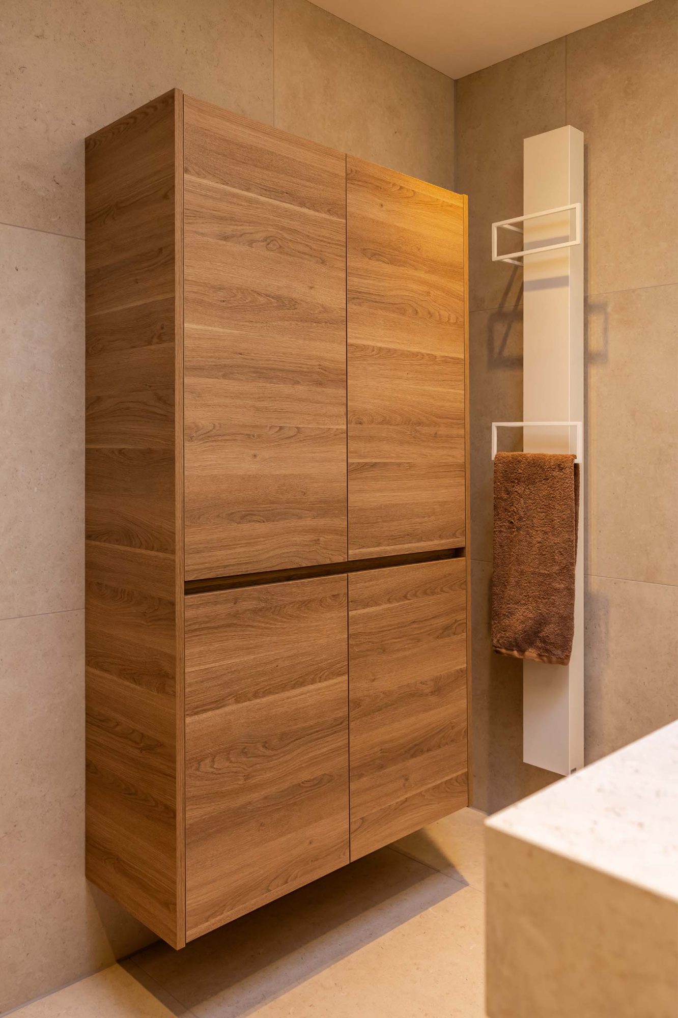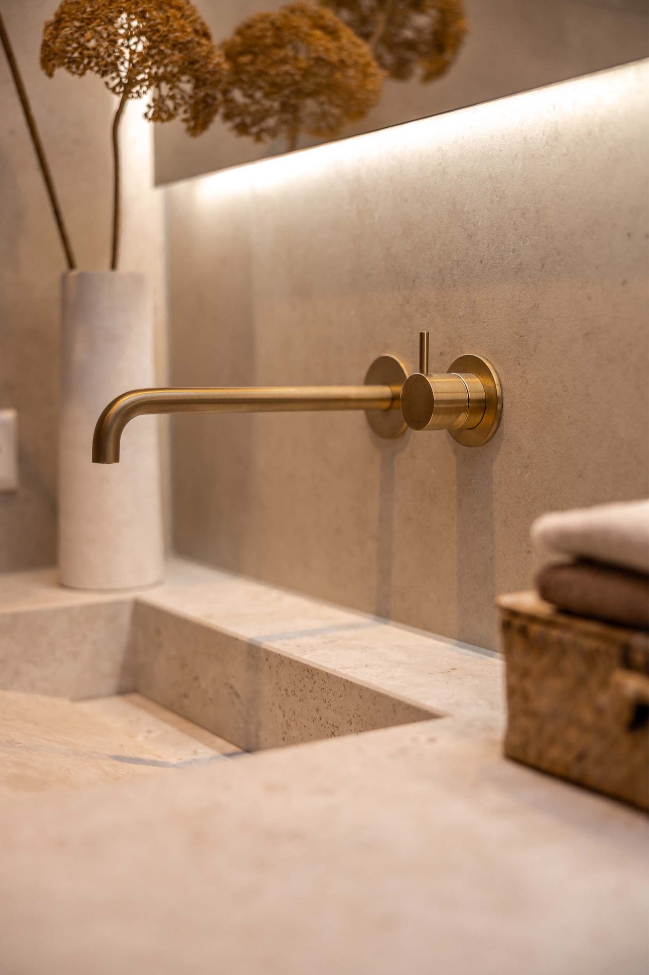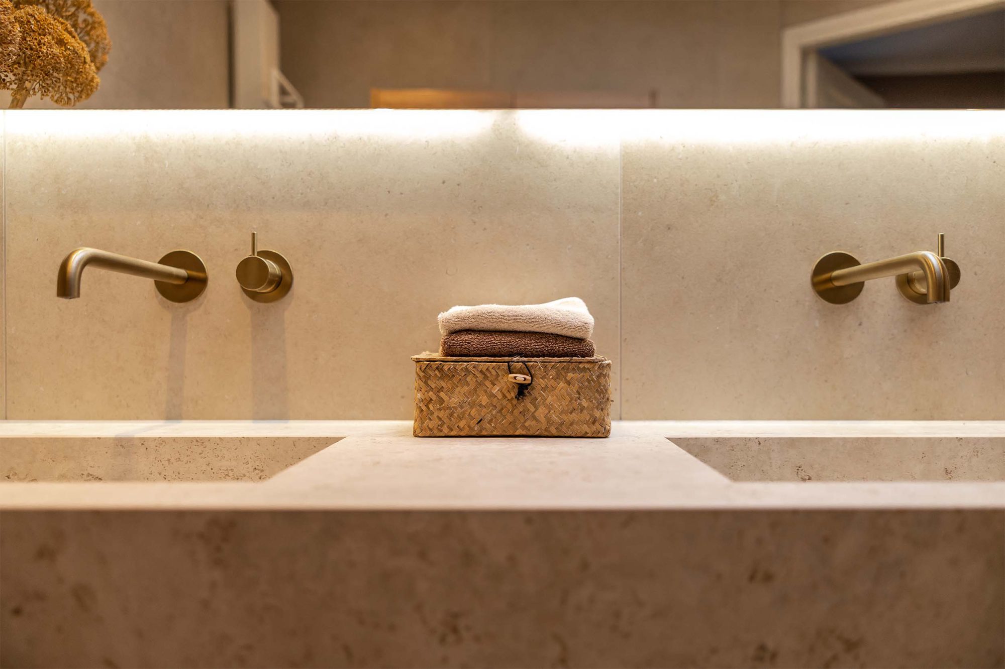 Kijk mee in deze luxe badkamer waar een op maat gemaakte wastafel van Cosentino centraal staat. De messing kranen van Hotbath geven een hotelchique uitstraling, terwijl de tegels op wand en vloer in dezelfde kleur zorgen voor een rustige en harmonieuze sfeer.