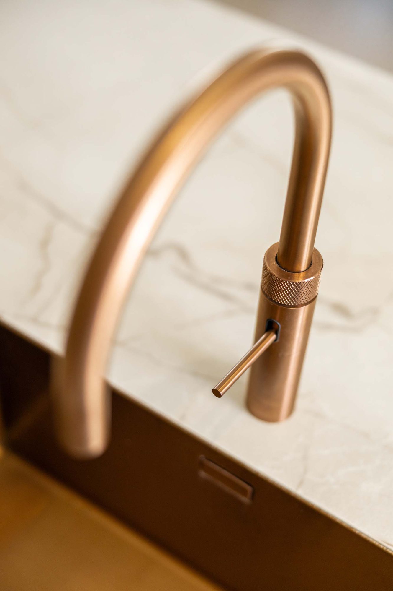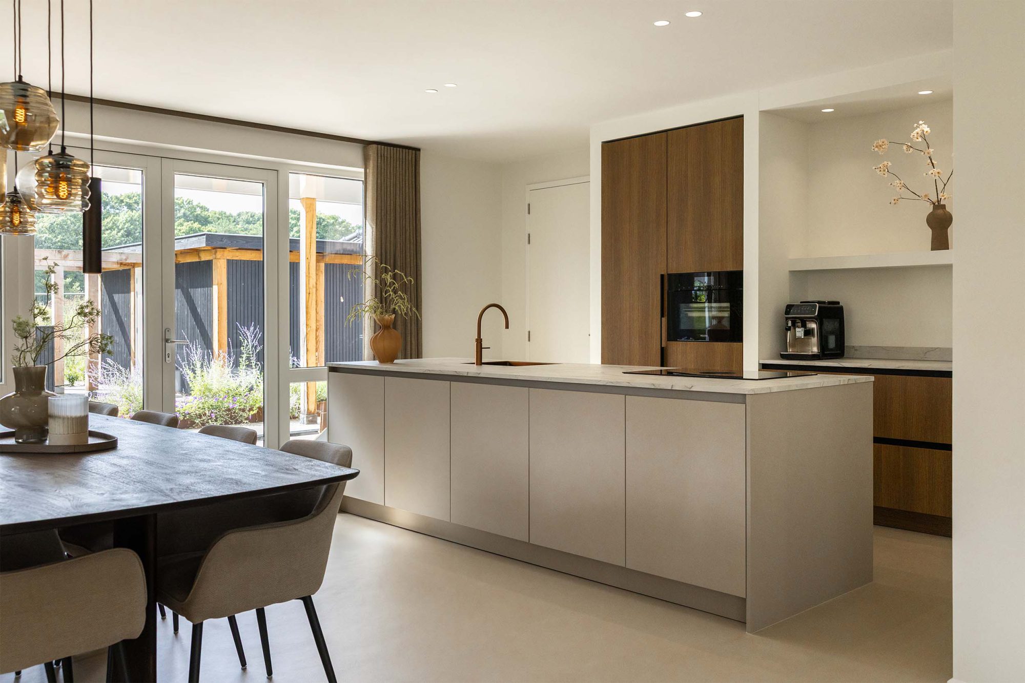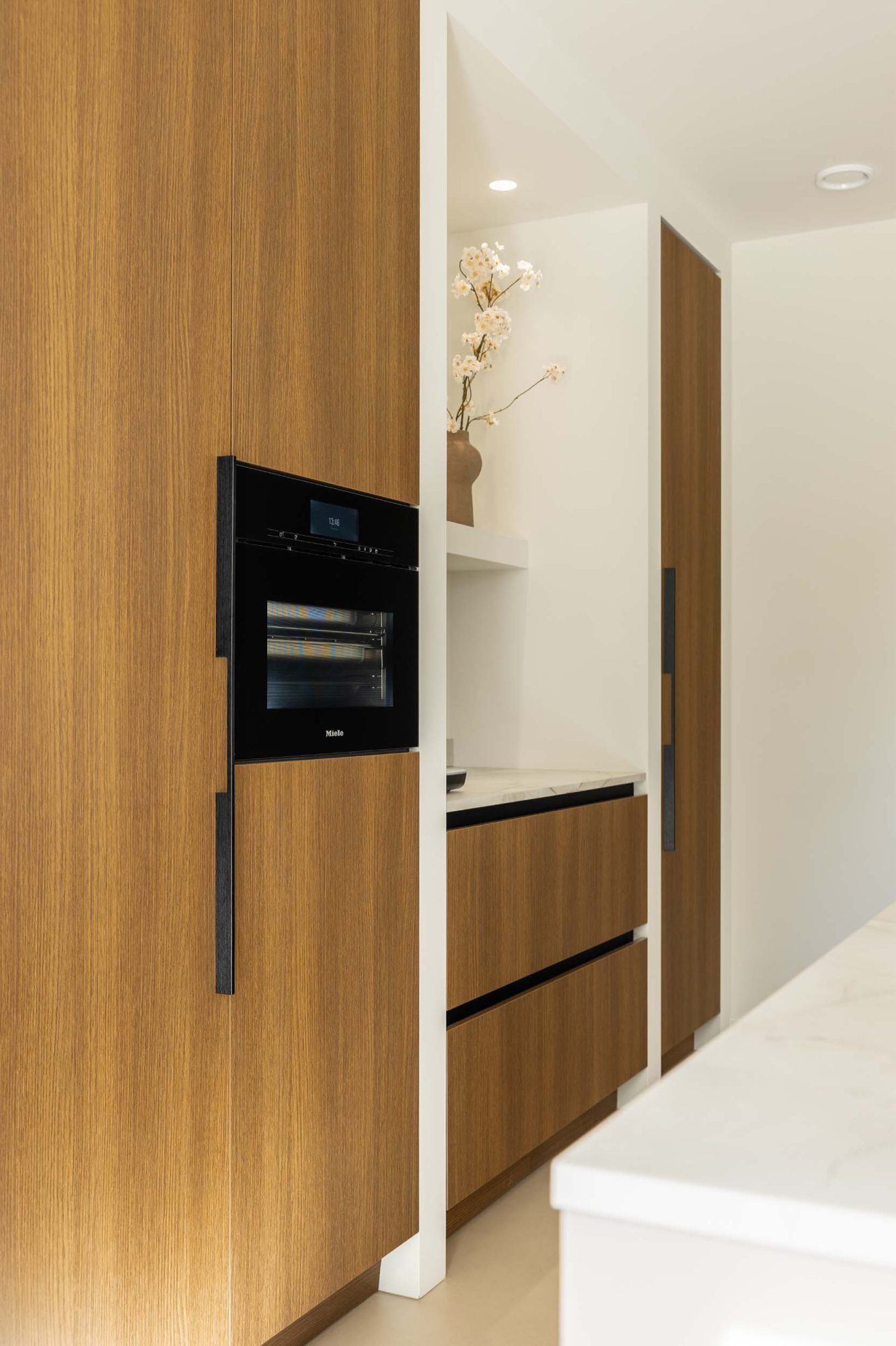 In deze elegante Japandi-keuken ervaart u direct rust. De subtiele aders in het slanke werkblad komen prachtig terug in de kasten, kraan en spoelbak. Samen met de warme vloertinten en de koffienis vormt dit een harmonieus en inspirerend geheel waar u zorgeloos van kunt genieten.