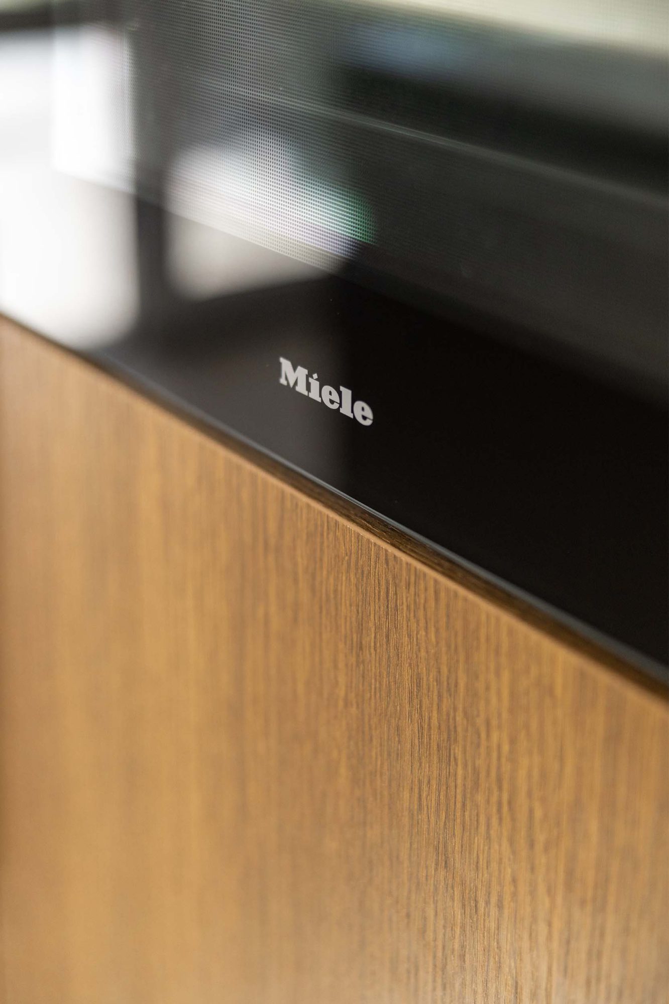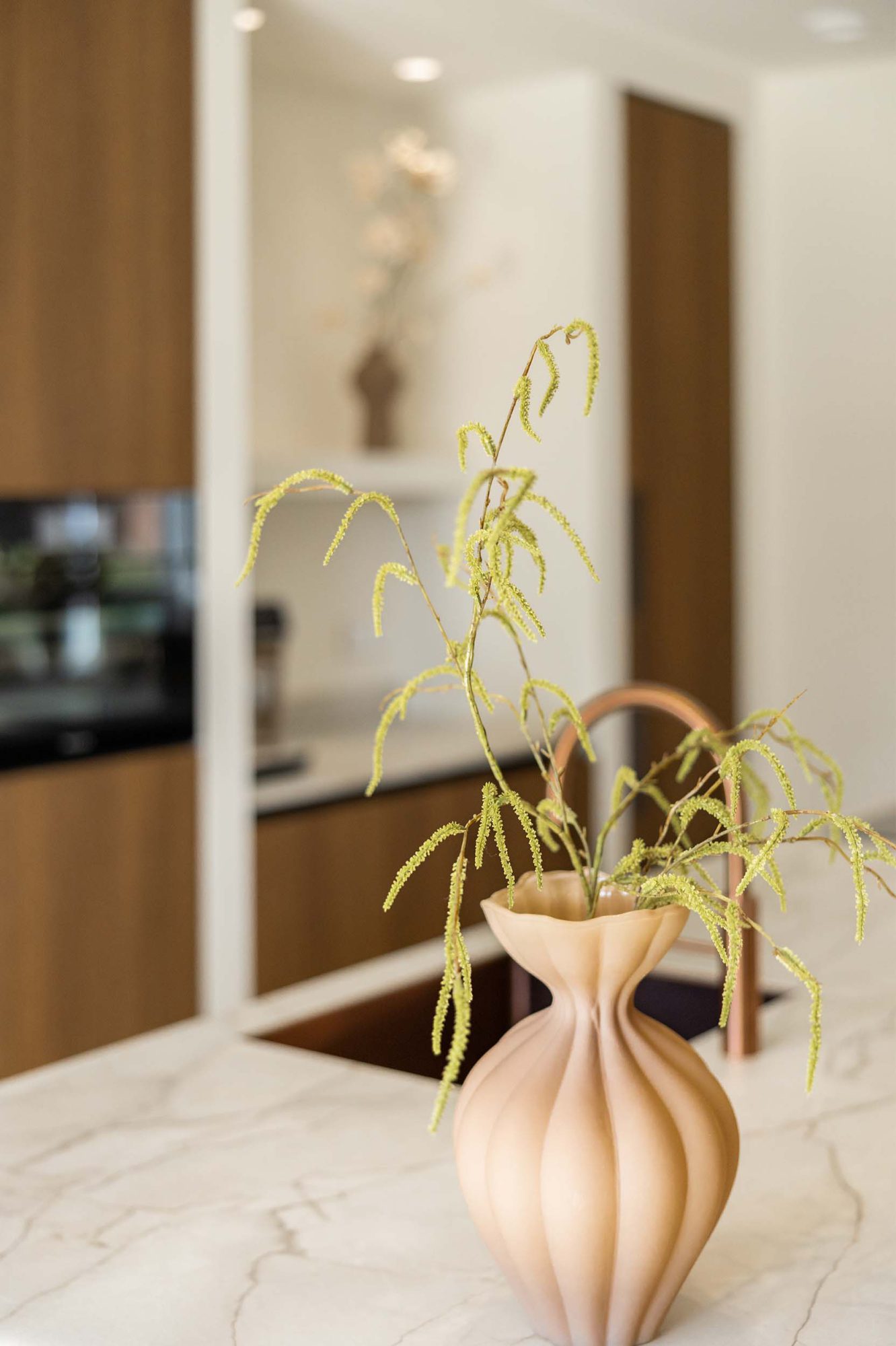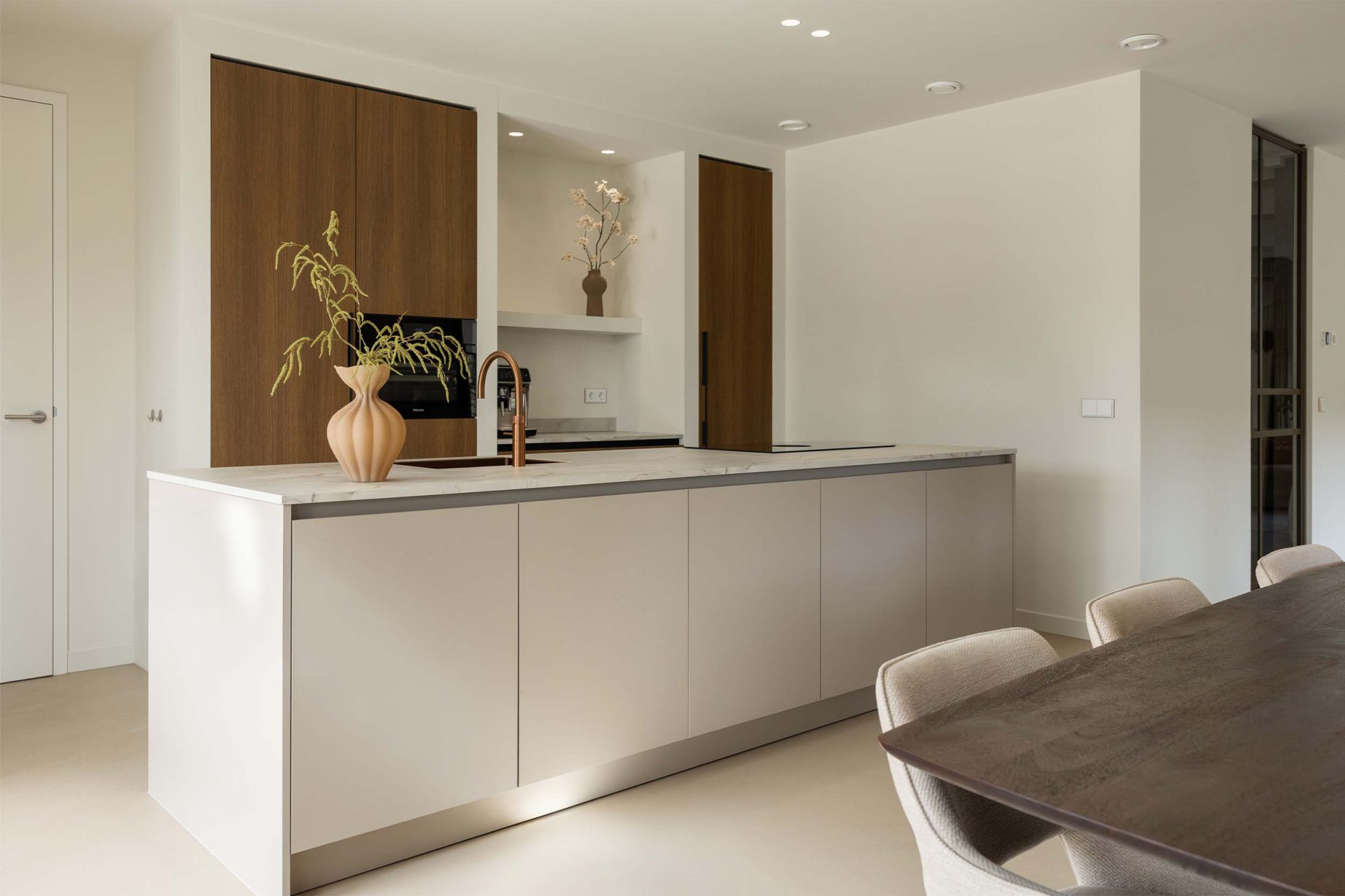 In deze elegante Japandi-keuken ervaart u direct rust. De subtiele aders in het slanke werkblad komen prachtig terug in de kasten, kraan en spoelbak. Samen met de warme vloertinten en de koffienis vormt dit een harmonieus en inspirerend geheel waar u zorgeloos van kunt genieten.
